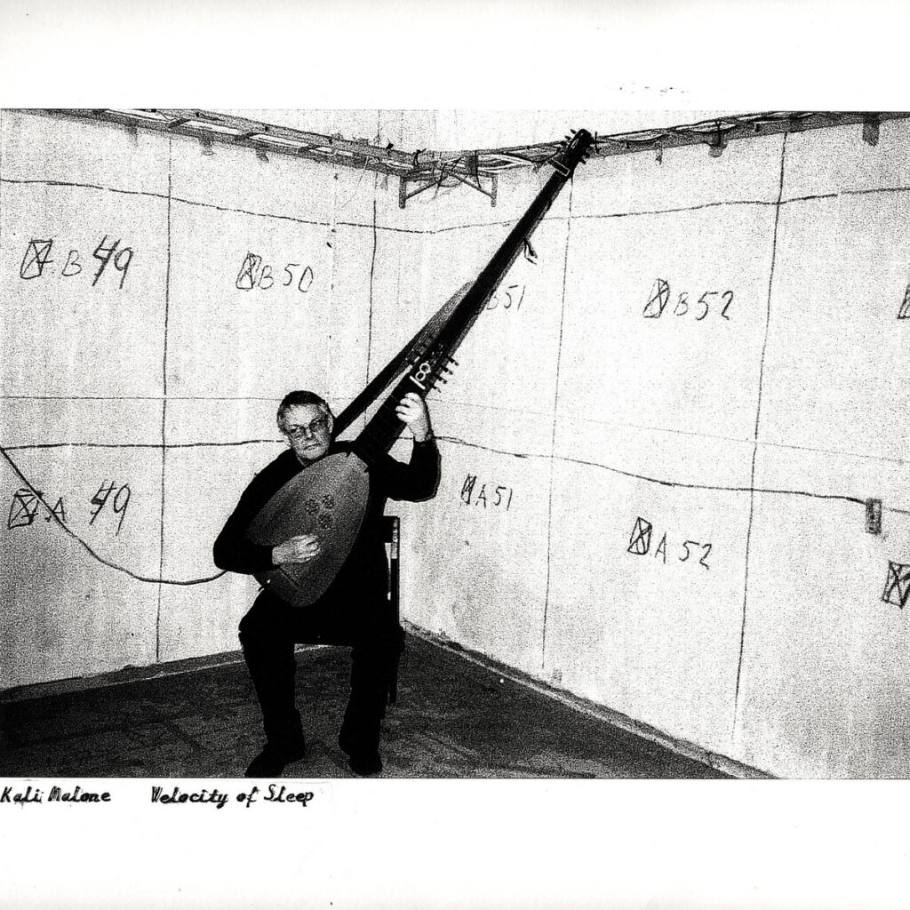 Composed, recorded and produced in Stockholm 2015-2016, ‘Velocity of Sleep’ sees Kali Malone’s work rendered in a septet of strings, gongs, lute, electronics and tape in the vast R1 Reaktorhallen (Sweden’s first nuclear reactor), the electroacoustic studio EMS, and at the Royal College of Music in Stockholm. Her presence is crucial, and liminal, making precise use of tuned sine waves and Studer B67 tape manipulation, while instrumental performance is handled by Peter Söderberg performing on the long-necked Theorbo (a large baroque lute, pictured on the sleeve), Samuel Löfdahl and Oskar Mattsson on Gongs, Vilhelm Bromander on Double Bass, Marta Forsberg on Viola and Adam Grauman on Viola de Gamba – all uniting to produce what feels like a geological time lapse and distillation of European and Indian classical drone musicks.